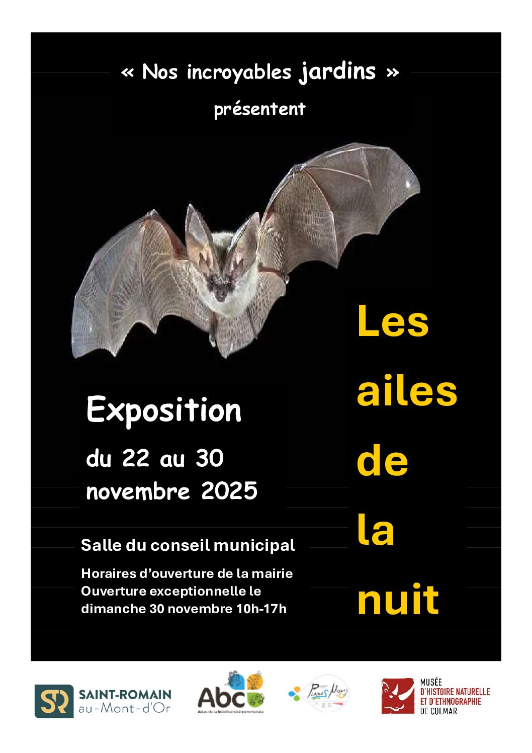Cette exposition présente de façon originale les chauves-souris, animal totem de notre commune, sous leurs différents aspects : la biologie et les modes de vie de cet animal, sa protection et son rôle dans la préservation de notre environnement.
